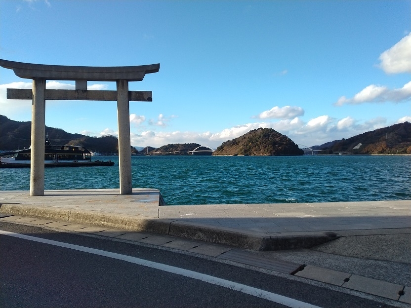 御手洗港から海沿いを歩いていくと、本殿と鳥居が、県道で分断されている