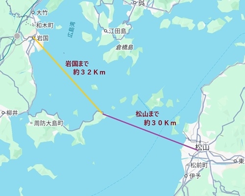 直線距離で、岩国と松山までの距離が、ほぼ変わらない・・・。という土地。