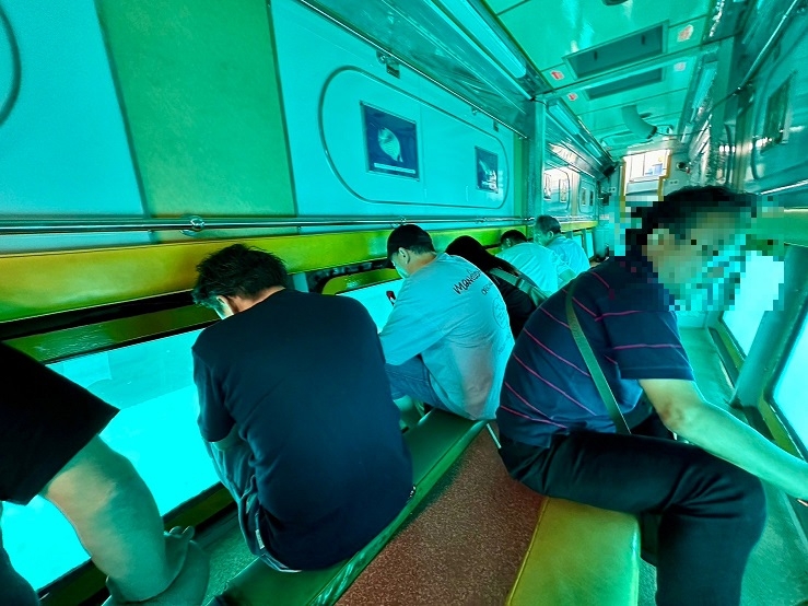 ほど航行し、沖合スポットに着くと、ガラス張りになった船底から、海底の