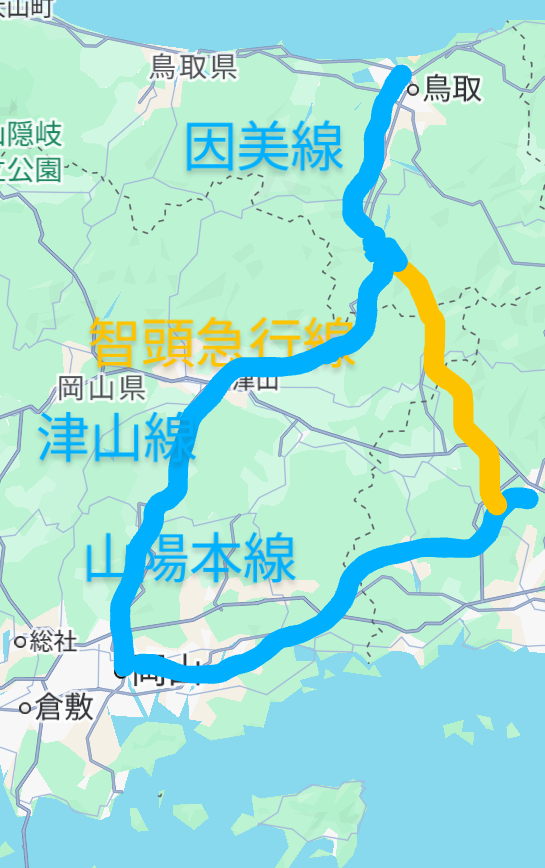 山から津山線・因美線経由で、山間をくねくねと急行列車で北上する方法