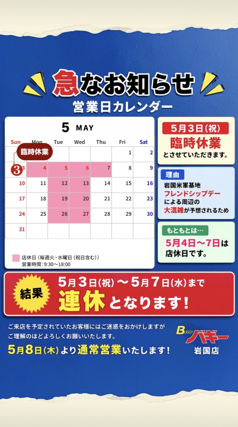 もともとの店休日(5/4〜5/7)と合わせて
